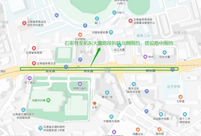 2、全季酒店至拓东大厦路段北侧围挡进行导改,原北侧围挡拆除后开放通行,将对道路路中进行围挡施工,围挡长度约1080m。围挡后道路仍维持双向4车道+双侧人非混行通道。