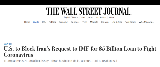 3月26日,美国财政部网站公布了对伊朗15名个人和5家企业实施制裁的名单。据《华尔街日报》4月7日报道,美国还计划阻止伊朗向国际货币基金组织(IMF)申请50亿美元紧急贷款。讽刺的是,蓬佩奥8日表示,“美国愿意提供援助,但伊朗拒绝了”。