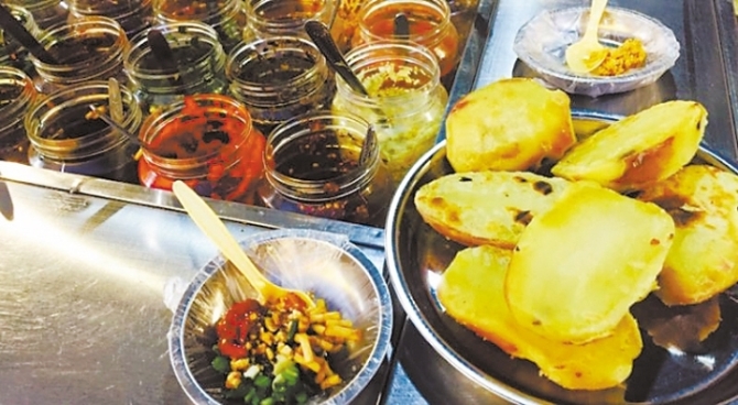 在泸西街头,这样的烤洋芋摊子很多,搭个伞棚,下面一张不锈钢质感的桌子,桌子一头的下面放着烤炉,上面堆满带皮的洋芋。一头的上面是装满各类酱料的罐罐,客人们围着酱料而坐,边流哈喇子边盯着洋芋的生熟进度。这样吃洋芋的方式,酱料无限自助,可即兴混合,可择其一种,全凭个人喜好。