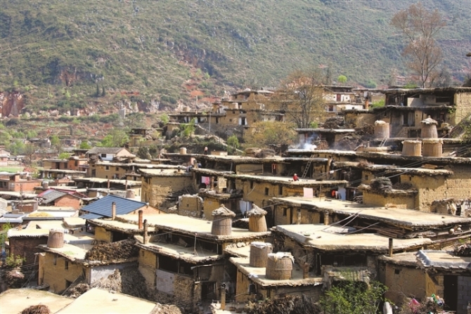 出县城约25公里,远远看见如梯田一般的城子古村,整个村落是一种被称作土掌房的建筑,全都以石为墙基,用土坯砌墙或用土筑墙,墙上架梁,梁上铺木板、木条或竹子,上面再铺一层土,经洒水抿捶,形成平台房顶,不漏雨水,可作晒场。有的大梁架在木柱上,担上垫木,铺茅草或稻草,草上覆盖稀泥,再放细土捶实。这些建筑多为平房,为彝族先民的传统民居,层层叠落,相互连通,堪称民居建筑文化与建造技术发展史上的“活化石”。