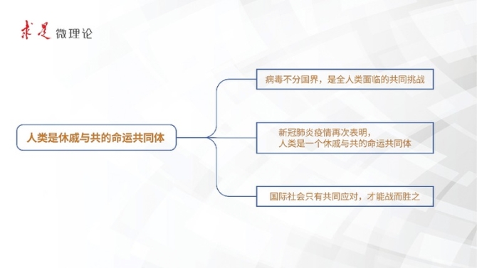 第一专题共10条,着重强调:病毒没有国界,疫情不分种族,人类是休戚与共的命运共同体,唯有团结协作、携手应对,国际社会才能战胜疫情;