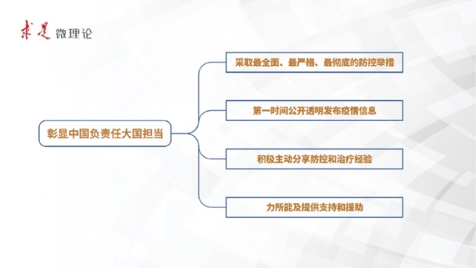 第五专题共6条,着重强调:中国及时采取果断有力措施,不仅是对本国人民健康负责,也是在为世界公共卫生事业作贡献,中国为抗击疫情付出了巨大牺牲,国际社会对此已有公论。