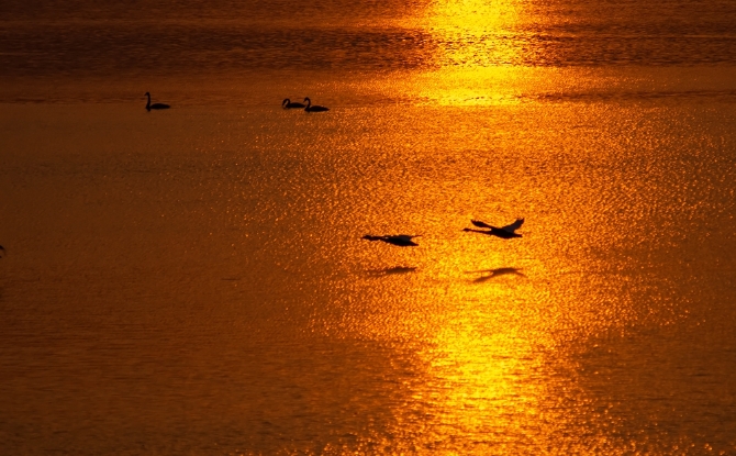 夕阳下的三门峡天鹅湖,几只天鹅自由地在波光粼粼的湖面上嬉戏。华龙网摄影王卫国