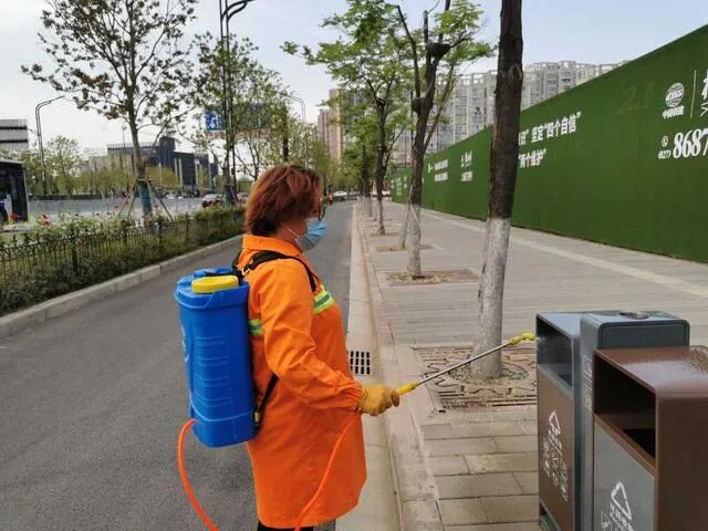 ↑4月15日,罗家莉在武汉市洪山区杨春湖路进行消杀工作。邓浩摄