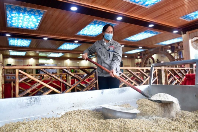 4月21日,青海省政府发布公告,经专项评估检查,民和回族土族自治县等17个贫困县(区)达到脱贫退出标准。至此,青海全省42个贫困县(市、区、行委)全部退出贫困县序列。图为青海省海东市互助土族自治县五十镇班彦村村民吕秀莲在村里的酒作坊内给青稞撒酒曲。
