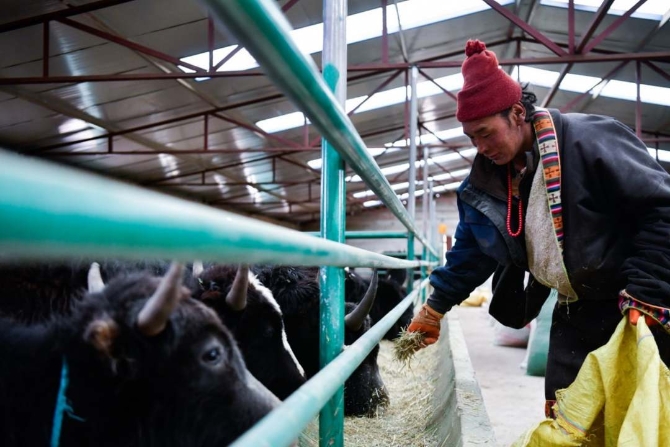 经过集中攻坚,履行退出程序,今年17个县(区)顺利退出,意味着青海省全部42个贫困县(市、区、行委)、1622个贫困村、53.9万贫困人口全部脱贫退出,实现了绝对贫困全面“清零”目标。图为青海省黄南藏族自治州泽库县宁秀乡拉格日村牧民多杰才旦在合作社的牛棚里喂牛。