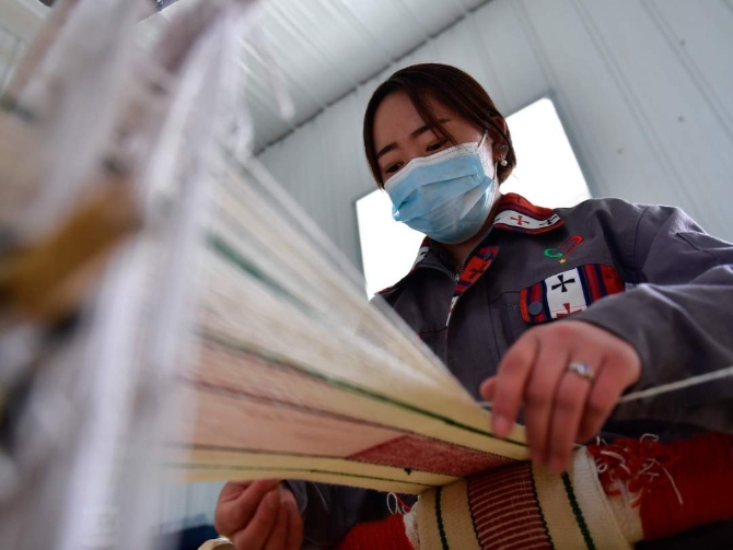在青海省海北藏族自治州刚察县文化产业孵化基地扶贫车间,当地牧民在加工氆氇。