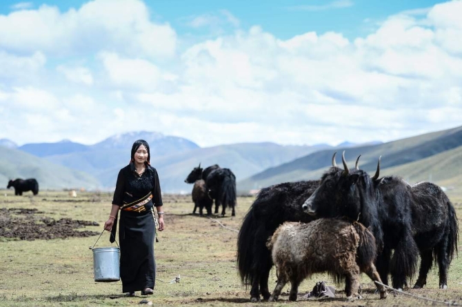 青海省果洛藏族自治州甘德县的合作社牧民在有机牧场内劳作。
