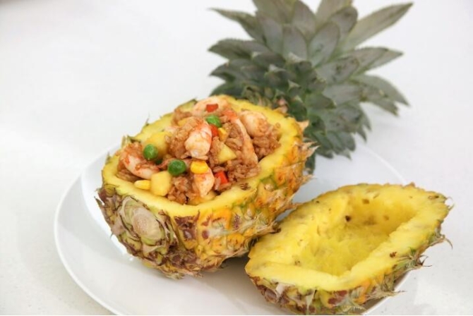 材料:菠萝1个,大约1斤8两;豌豆40g;红萝卜35g;玉米35g;新鲜虾仁35g;熟米80g。