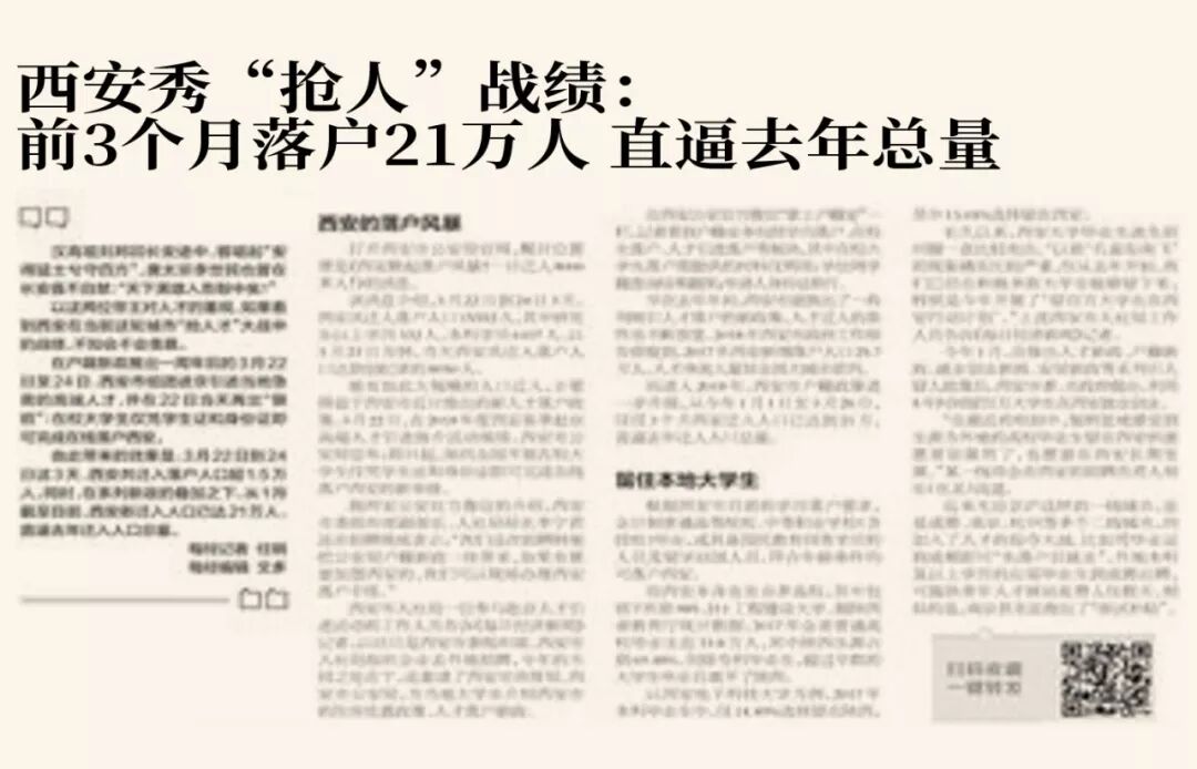 (2018年西安发布史上最宽松的落户政策:全国在校大学生仅凭学生证和身份证可在线落户,导致2018年迁入人数爆增,下图为《每日经济新闻》对此的报道)