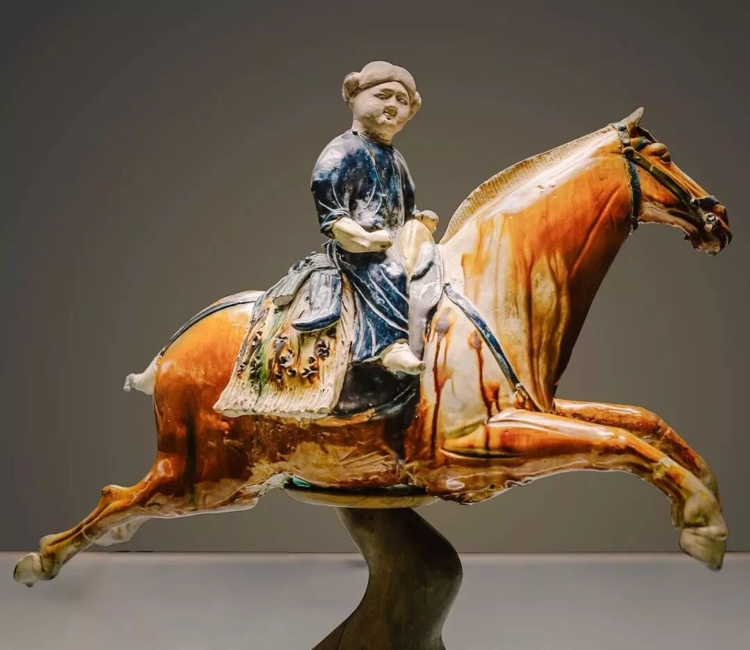 (唐三彩腾空马:骑马的唐代少女,女扮男装,两耳旁各梳有一个发髻,面部丰腴,笑容满面,双拳紧握于腰间自信地控制缰绳,马的体型彪悍,作腾空跃起式,是唐三彩中的精品,1966年西安制药厂唐墓出土现藏于西安博物院,摄影师@胡澍)