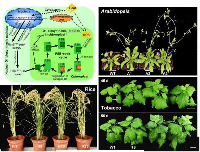 按照以往,科学家们大多从叶绿体内寻求解决方案,但郭房庆课题组突破思维定势,利用先进的遗传工程手段,克隆并构建了一个全新的、由高温响应启动子驱动的“融合基因”,并整合拟南芥、烟草和水稻的基因组。经过遗传转化,在拟南芥、烟草和水稻三种植物中,成功创建了一条全新的、细胞核融合基因表达的D1蛋白合成途径。