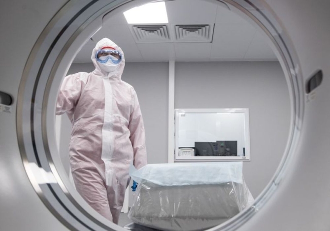 4月23日,医护人员在俄罗斯首都莫斯科市郊新建成的传染病医院内工作。(新华社/卫星社)
