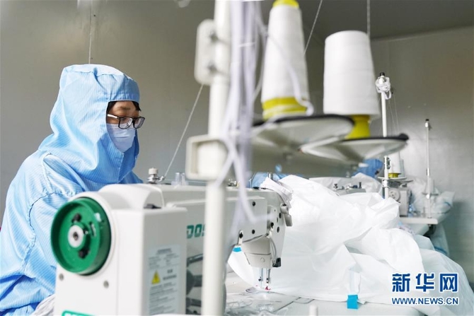 3月2日,在哈药集团制药总厂的医用防护服生产线,工作人员在进行生产作业。 新华社记者 王建威 摄