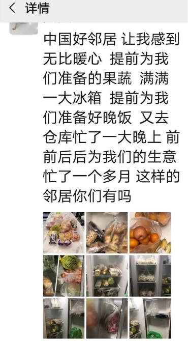 “大猪肘子吃得很香的。”刘先生发了一个朋友圈,配图是满满一大冰箱的食物,“中国好邻居,让我的心里暖暖的。”
