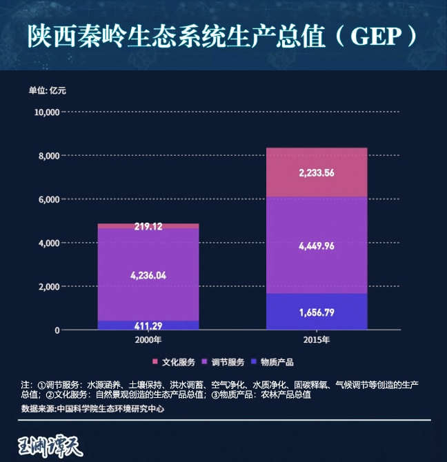 从2000年到2015年,按可比价计算,秦岭的GEP增加了3473.86亿元,增幅为71.4%。这其中最为突出的是文化服务,增加了整整9倍。