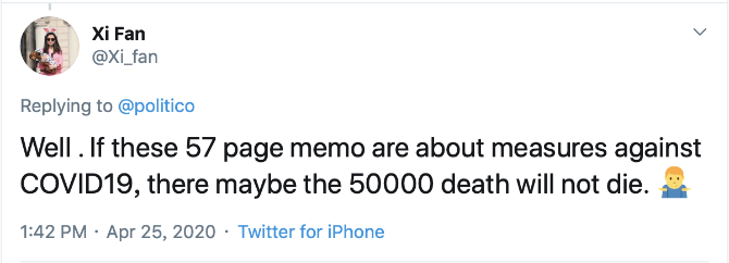 网民:“如果这份57页的备忘录是关于应对疫情的,或许那5万多因疫情死亡的美国人就不会死了。”↓↓↓