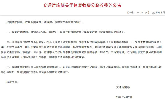 28日,交通运输部发布公告,宣布自2020年5月6日零时起,经依法批准的收费公路恢复收费(含收费桥梁和隧道)。其中,开放式收费高速公路和普通公路以车辆通过收费站收费车道的时间为准,封闭高速公路以车辆通过出口车道的时间为准。