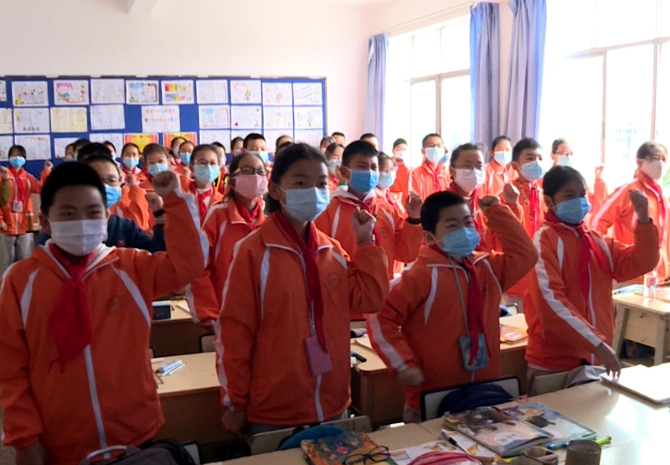 娄宸榕告诉我们,第一天来到学校,同学们都戴上了整齐的口罩,老师讲课也不把口罩摘下,虽然同学们还是很想拥抱和在一起玩耍,但是为了防控疫情,他们只能说说话,不能像以前一样拥抱和一起玩耍,下课休息的时候也是坐在自己的位置上看看书、看看远处,也不能一起到楼道上打闹玩耍。今天早上学校的升旗仪式,以前都是全校同学升旗,以后每个班轮流下来一次作代表性的升旗仪式,其余班级都在教室里升旗。