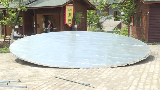 “锅的重量就达3.6吨,锅盖要5个人一起才能抬起。锅支起来再装水和牛肉,总重近10吨,所以,他们又制作一个2.4米高的锅架来固定这口大锅。”工人师傅介绍说。
