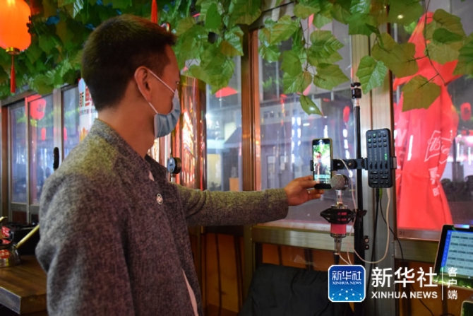 ↑5月4日,天津市南开区奥城商业广场一家陕西风味餐厅的工作人员在进行网络直播。新华社记者 白佳丽 摄