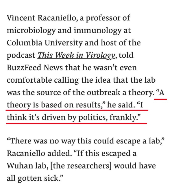 哥伦比亚大学微生物和免疫学教授文森特·雷卡纳罗(Vincent Racaniello)也称,他甚至不愿意把“病毒系实验室制造”的观点称为阴谋论,因为“‘论’都是基于实际结果的,而有关病毒来自实验室的观点,老实说,我觉得是基于政治”。
