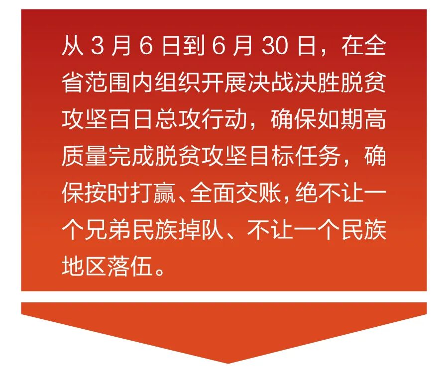 云南省坚持一手抓疫情防控,一手抓脱贫攻坚,迅速发起决战决胜脱贫攻坚百日总攻行动,抓实挂牌督战,坚决啃下最后“硬骨头”,坚决攻克最后贫困堡垒,确保2020年6月底前剩余建档立卡贫困人口、未出列贫困村、未摘帽县全部达到脱贫退出标准,脱贫摘帽成果得到有效巩固,实现“户户达标、村村提升、县县清零”目标,确保全面建成小康社会标志性工程取得全胜。
