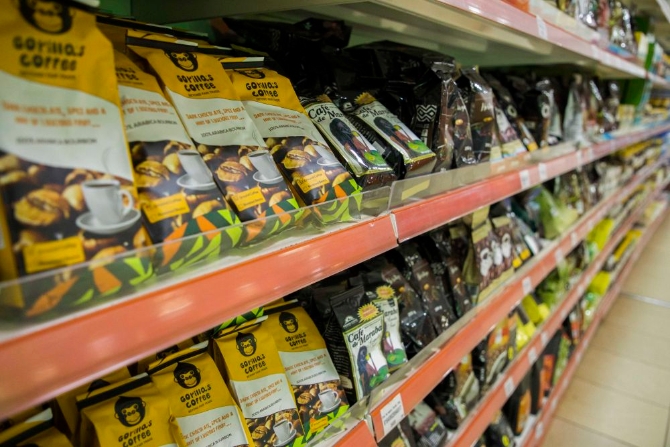 5月15日,在卢旺达首都基加利,不同品牌的卢旺达咖啡摆在商店货架上出售。新华社发(西里尔·恩德格亚摄)