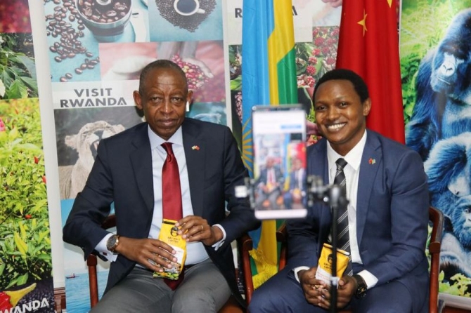14日晚9时30分,联合国副秘书长、非洲经济委员会执行秘书松圭,卢旺达驻华大使詹姆斯·基蒙约和阿里巴巴集团董事、蚂蚁金服董事长井贤栋以及“带货主播”薇娅一起,在1000多万人在线观看的直播间为卢旺达咖啡“带货”。