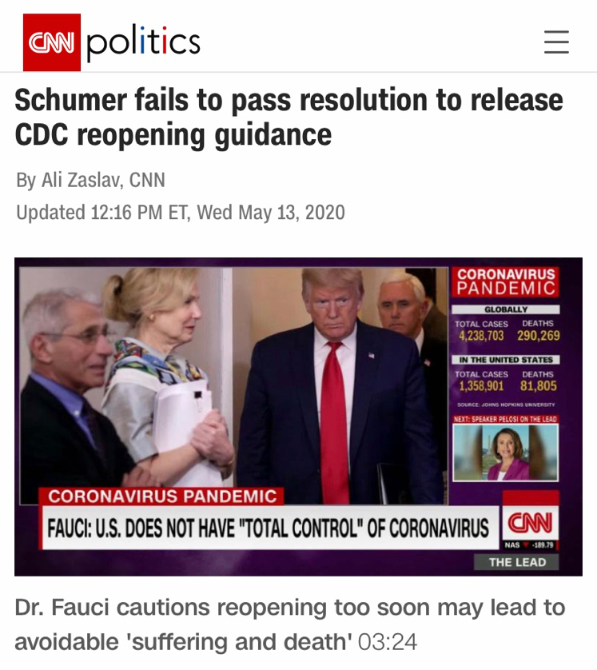 5月13日,美国国会参议院共和党人否决了美国疾控中心制定的经济重启指南的决议。这份长达63页的报告与白宫此前4月17日发布的“重启美国计划”相比,体现了美国疾控中心与白宫在新冠疫情公共政策上的分歧,暴露了白宫因着急重启而无视公众健康的面目。