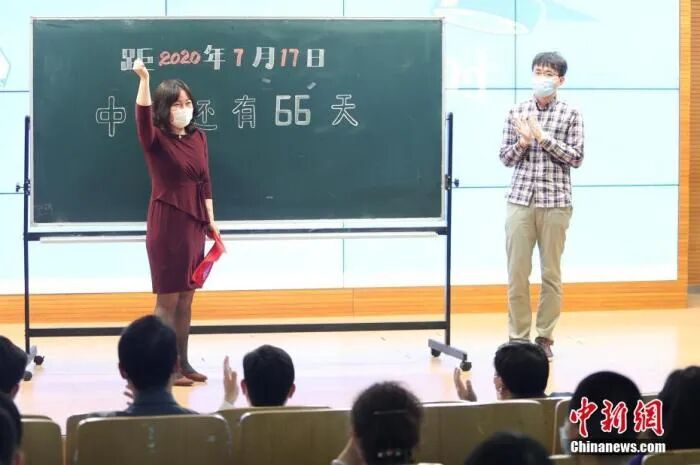 资料图:5月11日,在位于北京市西城区的北京师范大学附属实验中学内,教师代表为中考倒计时牌揭幕。当日,北京初三年级学生返校复课。 中新社记者 蒋启明 摄