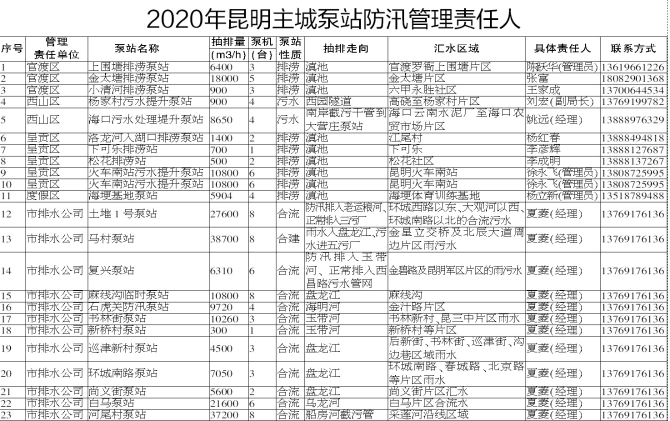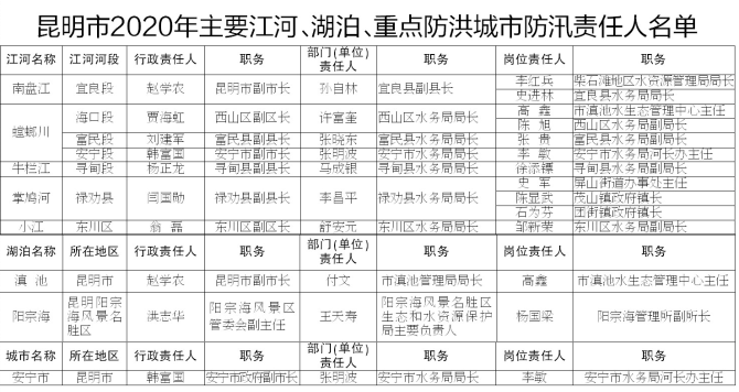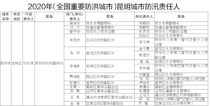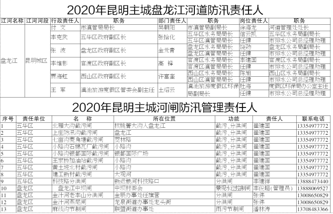 今年汛期,为进一步贯彻落实防汛工作各级人民政府行政首长负责制为核心的各项责任制,根据《中华人民共和国防洪法》《云南省防洪条例》有关规定,并结合昆明市实际,市防汛抗旱指挥部将昆明市2020年主要江河、湖泊、重要城市、大中型水库防汛工作责任人予以公布明确,要求每座水库都有专人巡查防守,一旦出险及时发布预警信息,及时转移危险区域人员,及时抢护处置险情。