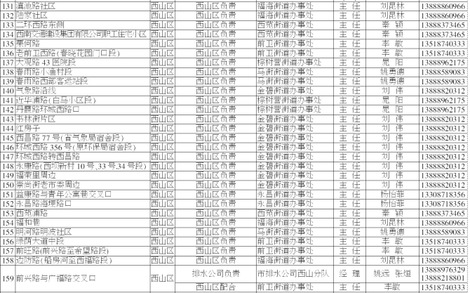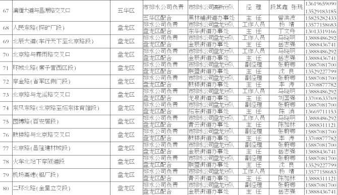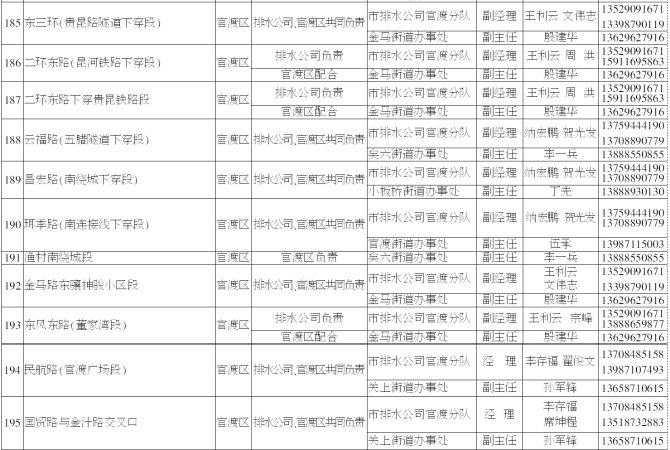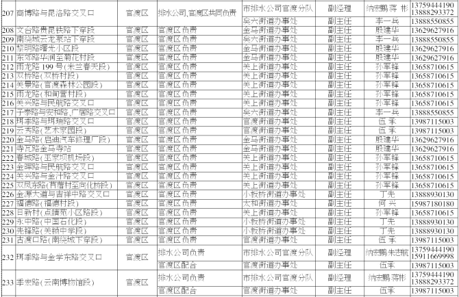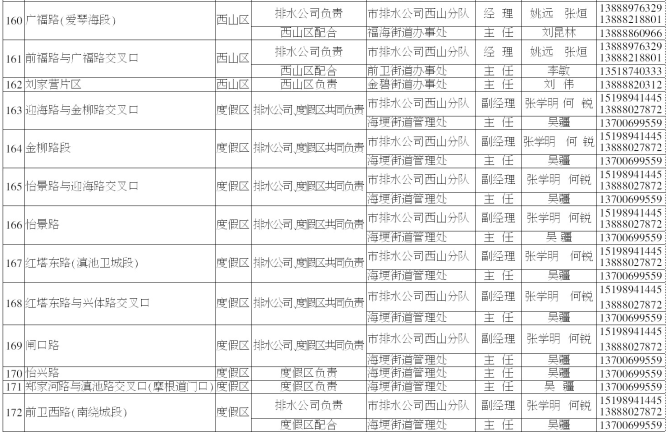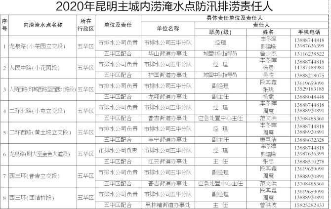 由于昆明特殊的地理和气候特点,进入主汛期后,降雨时空分布不均,极易出现局地单点暴雨,引起城市内涝。对此,汛期前,全市各级防汛部门已组织对全市范围内的重要设施、防汛准备、主城区范围内易涝淹水点等开展督查检查和排查。并根据各单位上报,经复核,昆明城市防汛指挥部明确并公布了2020年昆明城市防汛责任人。各级各部门、各防汛责任单位及责任人将认真履行防汛工作职责,全力以赴抓好城市防汛度汛工作,确保昆明城市防汛安全。与此同时,进一步明确主城区易涝区域、立交桥下层、下穿隧道、地下车库、闸门、泵站的责任人和责任内容,建立上下联动的工作机制。要求主城各区对辖区内所有易淹水点认真梳理研究,按照“小雨不积水、大雨退水快”的原则制定“一点一策”永久或应急整治措施,实施工程整治。同时,针对汛期可能出现的强降雨,完善应急预案,落实设备、队伍和抽排路径,确保淹积水得到及时有效处置。