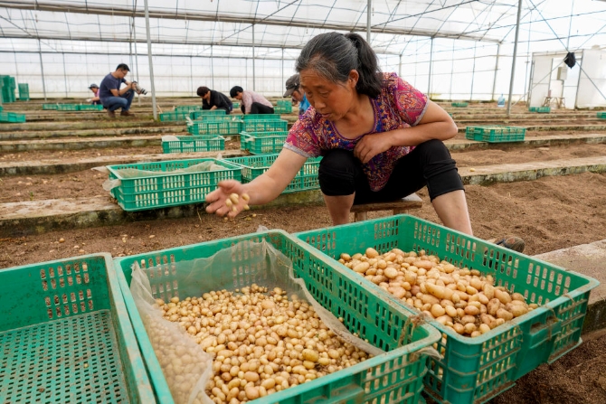 5月26日,在重庆巫溪县薯光农业科技开发有限公司脱毒马铃薯繁育中心的马铃薯种薯大棚,当地农户按照技术人员的要求采收马铃薯微型薯。近年来,重庆市巫溪县大力发展马铃薯产业,全县累计有1.4万贫困户通过种植马铃薯实现脱贫增收。(新华社记者刘潺摄)