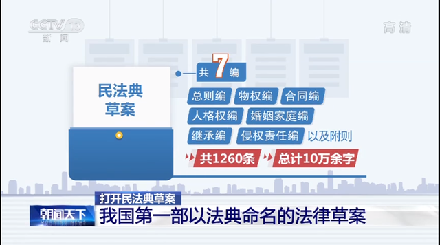 民法典草案共7编,依次为总则编、物权编、合同编、人格权编、婚姻家庭编、继承编、侵权责任编,以及附则,共1260条,总计10万余字,是新中国成立以来条文字数最多的一部法律草案。