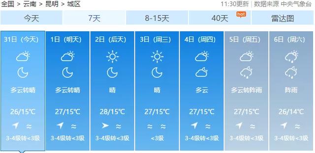 5月31日20时--6月1日20时:昆明主城区晴间多云,气温14~27℃。昭通南部、曲靖北部和东部、文山东部阴有中雨局部大雨,昭通北部、曲靖西部、昆明东部、文山西部、红河南部、迪庆、怒江、丽江东部、保山、德宏、临沧、普洱西部、西双版纳多云有阵雨局部中雨,其他地区多云间晴。