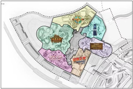 主要分为六个主题区(派拉蒙大道、冒险之城、花生小镇、失落王国、恐龙帝国、最终边疆)和一个后勤区。