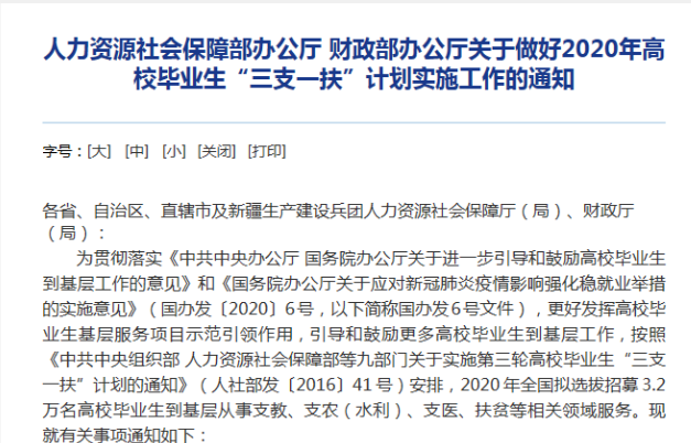 人社部、财政部印发通知,部署实施2020年高校毕业生“三支一扶”计划,2020年全国将招募3.2万名高校毕业生到基层从事支教、支农(水利)、支医和扶贫等“三支一扶”工作,比2019年增加5000名。