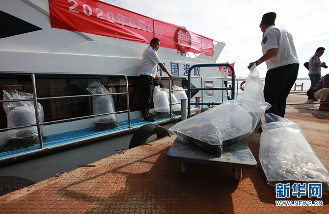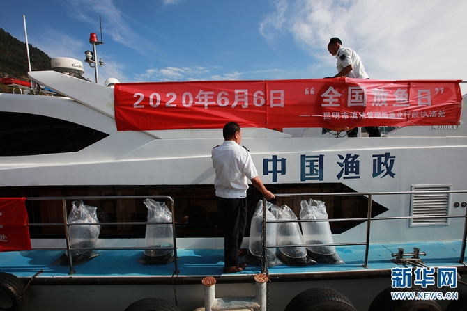 工作人员把即将投放的鱼类放到船上(摄于6月6日)。(新华网 范芳钰 摄)