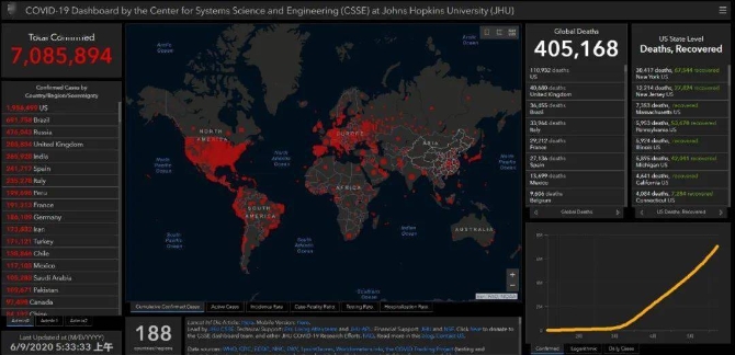 据美国约翰斯·霍普金斯大学发布的实时统计数据显示,截至北京时间6月9日5时33分左右,全球累计确诊新冠肺炎病例7085894例,累计死亡405168例。
