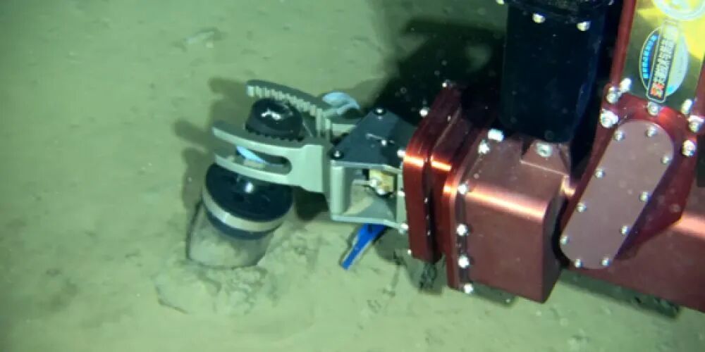 “海斗一号”的机械手正在抓取海底沉积物样品。(图片由沈阳自动化所提供)