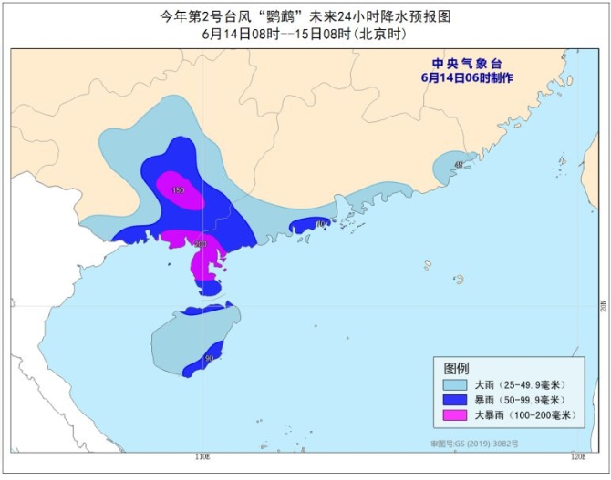 降水预报:14日08时至15日08时,广东南部沿海、广西中南部、海南岛有大到暴雨,其中,广西东南部、广东西南部的部分地区有大暴雨(100-200毫米)。
