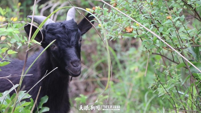 羊圈里关着8只黑山羊,是熊文达一家脱贫致富的希望。他给三头母羊戴上铃铛,用一个塑料瓶子装了半瓶包谷,拿根绳子系住挂在脑袋上,他双手插在胶鞋里在前面“走”,羊们惦记着瓶子里的包谷,乖乖地跟在他身后,朝着大山走去。