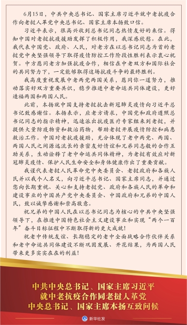 新华社北京6月15日电 6月15日,中共中央总书记、国家主席习近平就中老抗疫合作向老挝人革党中央总书记、国家主席本扬致口信。