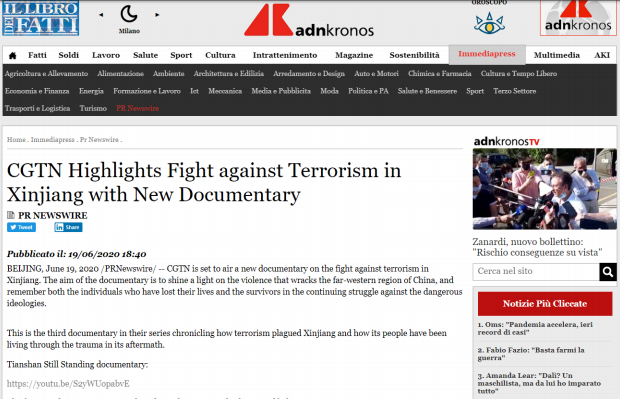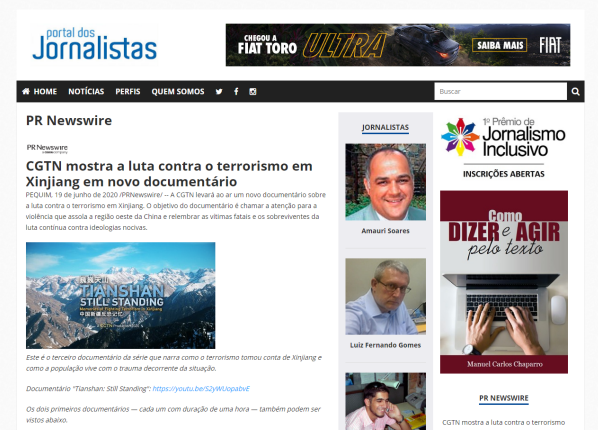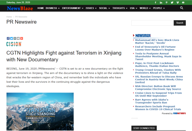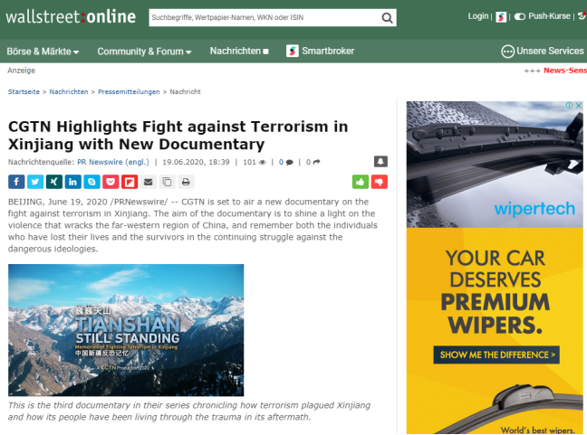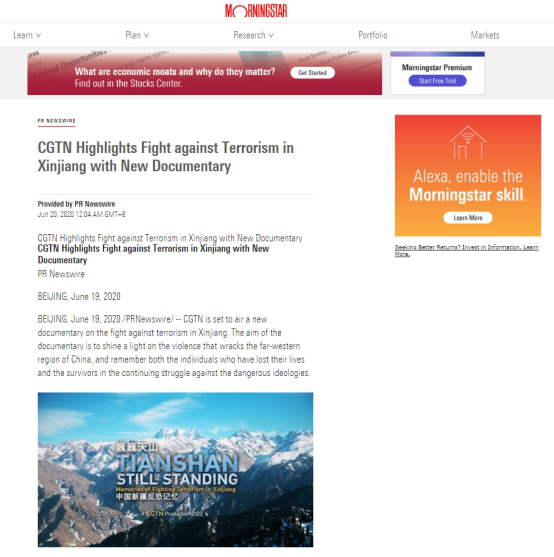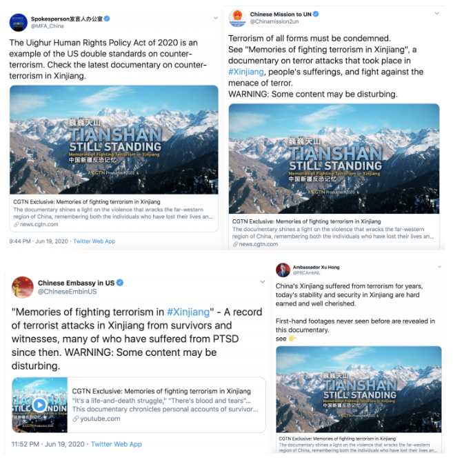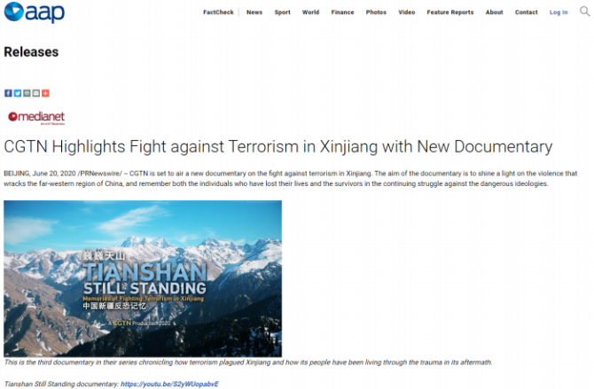 2019年12月5日和7日,CGTN先后播出了两部以新疆反恐为主题的纪录片《中国新疆,反恐前沿》和《幕后黑手——“东伊运”与新疆反恐》,以罕见的“大尺度”披露了新疆反恐三十年中的严峻形势与深层原因,引发了国内外观众极大关注。时隔半年,CGTN再次重磅推出第三部反恐纪录片《巍巍天山——中国新疆反恐记忆》。该纪录片及相关报道被全球27个国家和地区的475家网络媒体全文转载,全网阅读量达5.17亿,呈现出多元化传播态势,覆盖受众广泛,再次成为舆论焦点。