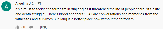 网友Gabriel Metzger在CGTN Youtube平台评论称,“当你看到一个喷子在这里反对每一个亲华评论时,这意味着CGTN正在做正确的事情,即向世界展示让他们紧张的事实。有人可能会说,这些喷子是被蒙住了眼睛或者被洗脑了,但是看到新疆的恐怖主义镜头后,他们仍然不能接受事实,很简单,他们是反人类的。毕竟,是美国首先资助了恐怖主义。”