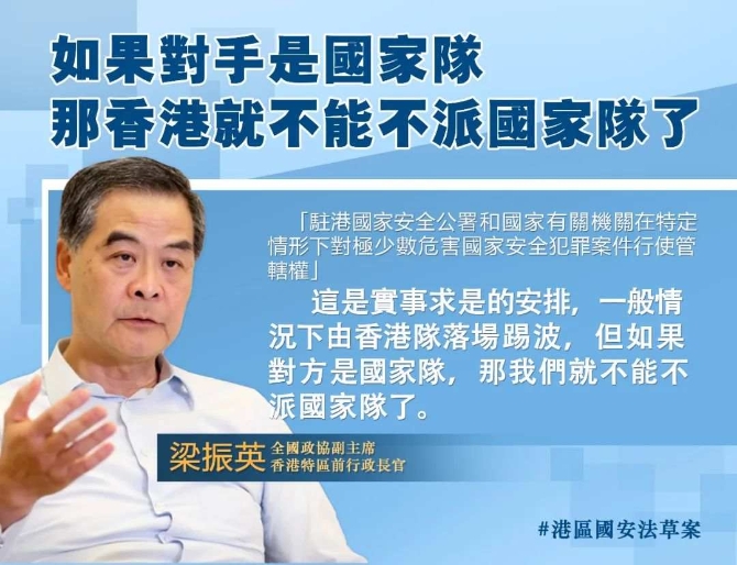 全国政协副主席梁振英日前引述《港区维护国家安全法》草案的说明称:“驻港国家安全公署和国家有关机关在特定情形下对极少数危害国家安全犯罪案件行使管辖权,是中央全面管治权的重要体现,有利于支持和加强香港特别行政区维护国家安全执法工作和司法工作,有利于避免可能出现或者导致出现香港特别行政区基本法第十八条第四款规定的紧急状态情形”。