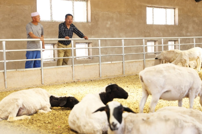 宁夏同春缘农业科技发展有限公司董事长雷灿煌(右)正在和员工查看杜泊羊养殖情况