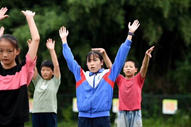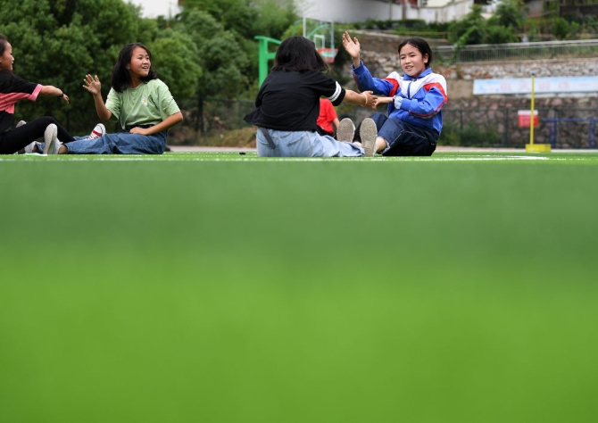 蔡齐艳(右一)和同学一起在体育课上做小游戏。