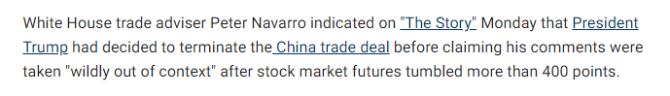 报道开头则明明白白指出:纳瓦罗周一刚在节目里说总统决定终止与中国的贸易协议,但是股票期货市场下跌超过400点之后,他就宣称自己“被严重断章取义”了。